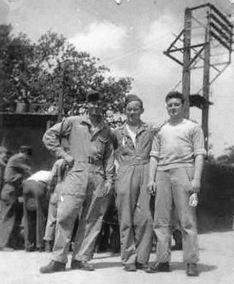 Photo was taken on a down day, coming back from a craps game with two of his fellow crew members. Earl is on the right. He passed away last year on November 3rd 2008, and was from Altoona, Pennsylvania. (Photo courtesy of the Earl Kauffman)